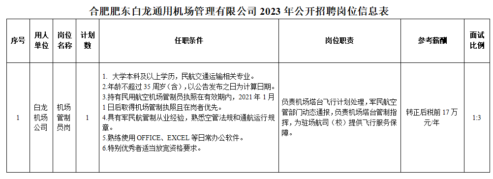 为提升机场管制保障能力,满足业务发展需要,现就肥东白龙机场公司招聘工作人员公告如下。