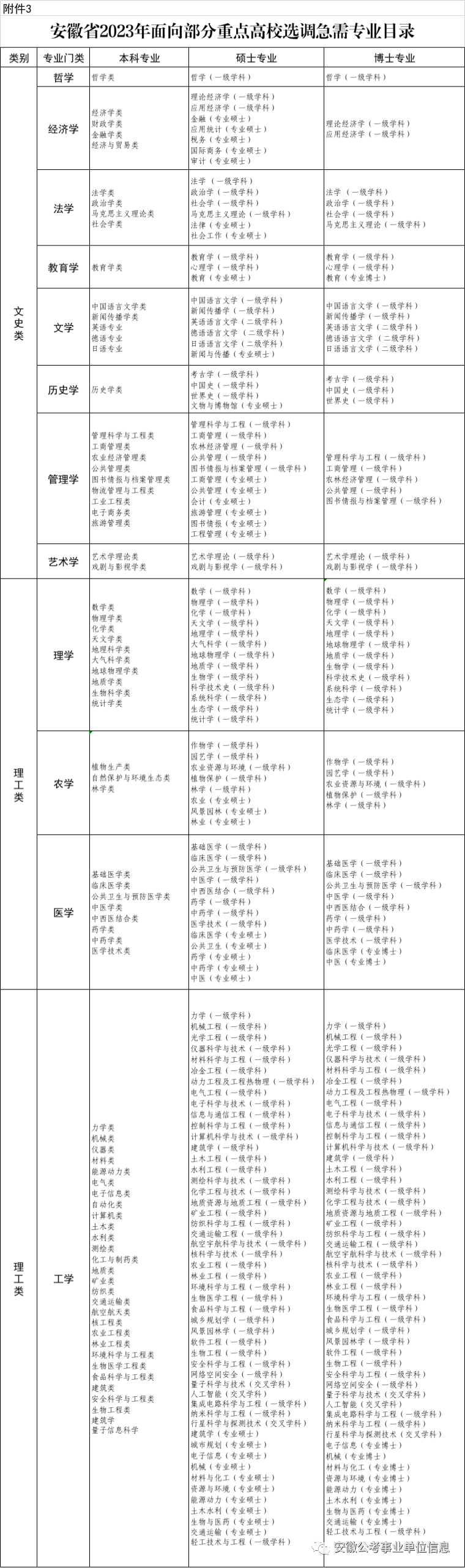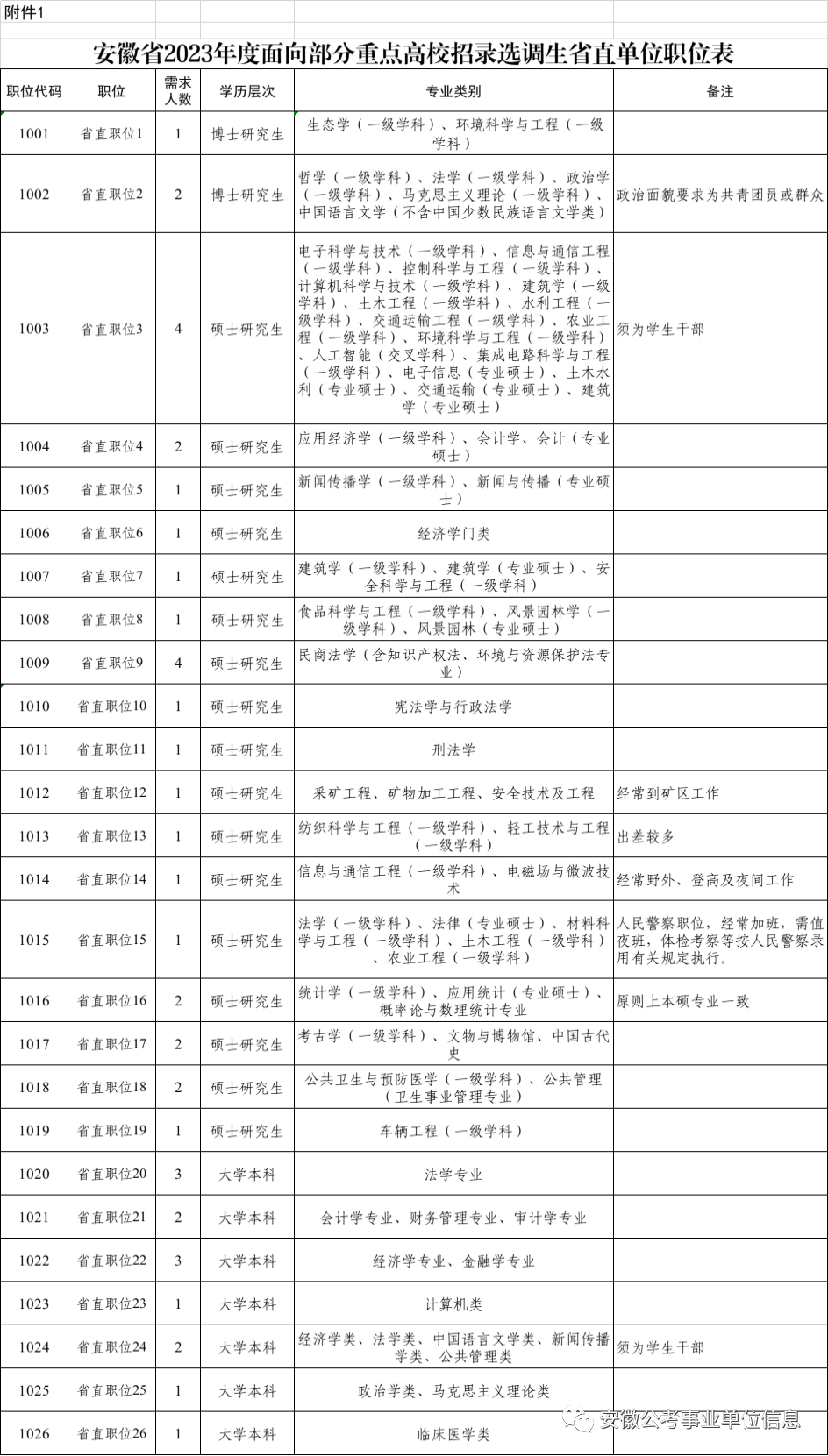 安徽省2023年度面向部分重点高校招录选调生省辖市职位表